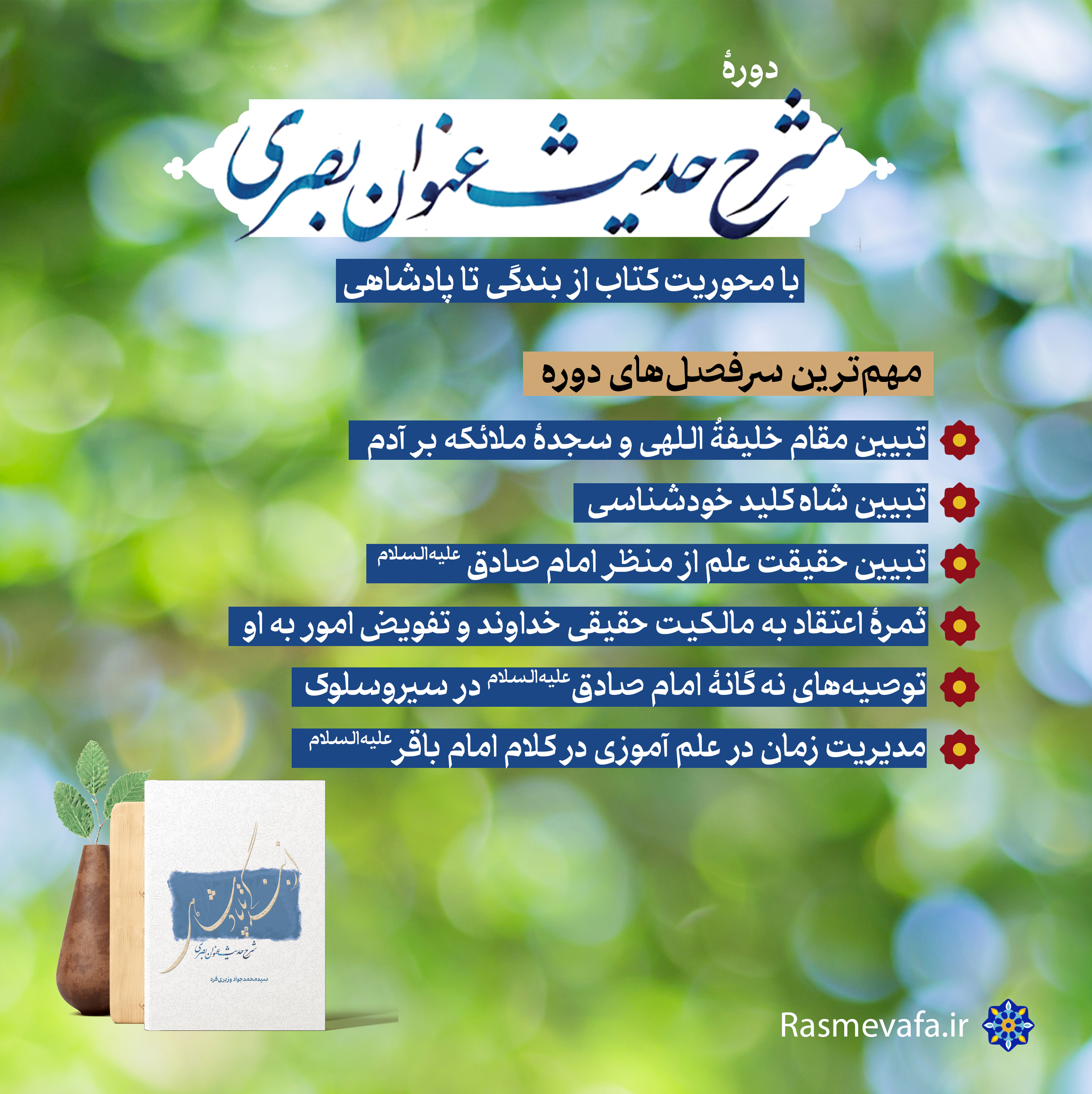 دوره شرح حدیث عنوان بصری، حاصل تدوین مجموعه جلسات شرح این حدیث نورانی توسط استاد محترم حجت الاسلام و المسلمین سید محمد جواد وزیری است که در40 تدوین شده است و انشاء الله کمک کار علاقه مندان به شناخت خدا و سیروسلوک معنوی باشد.